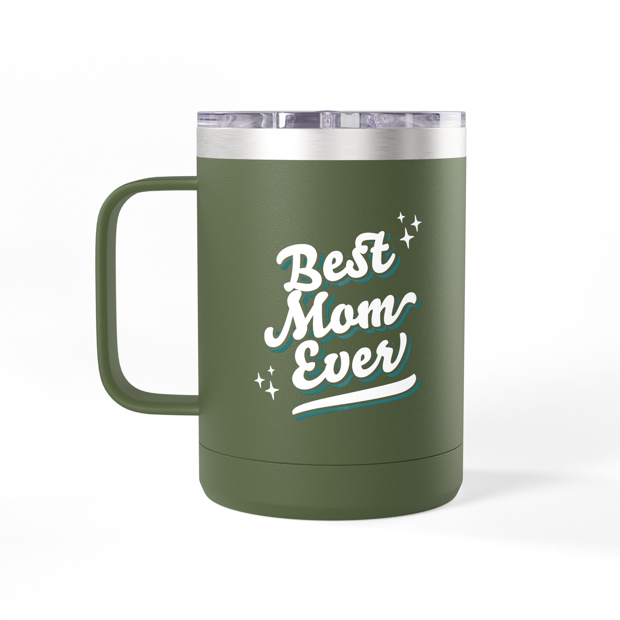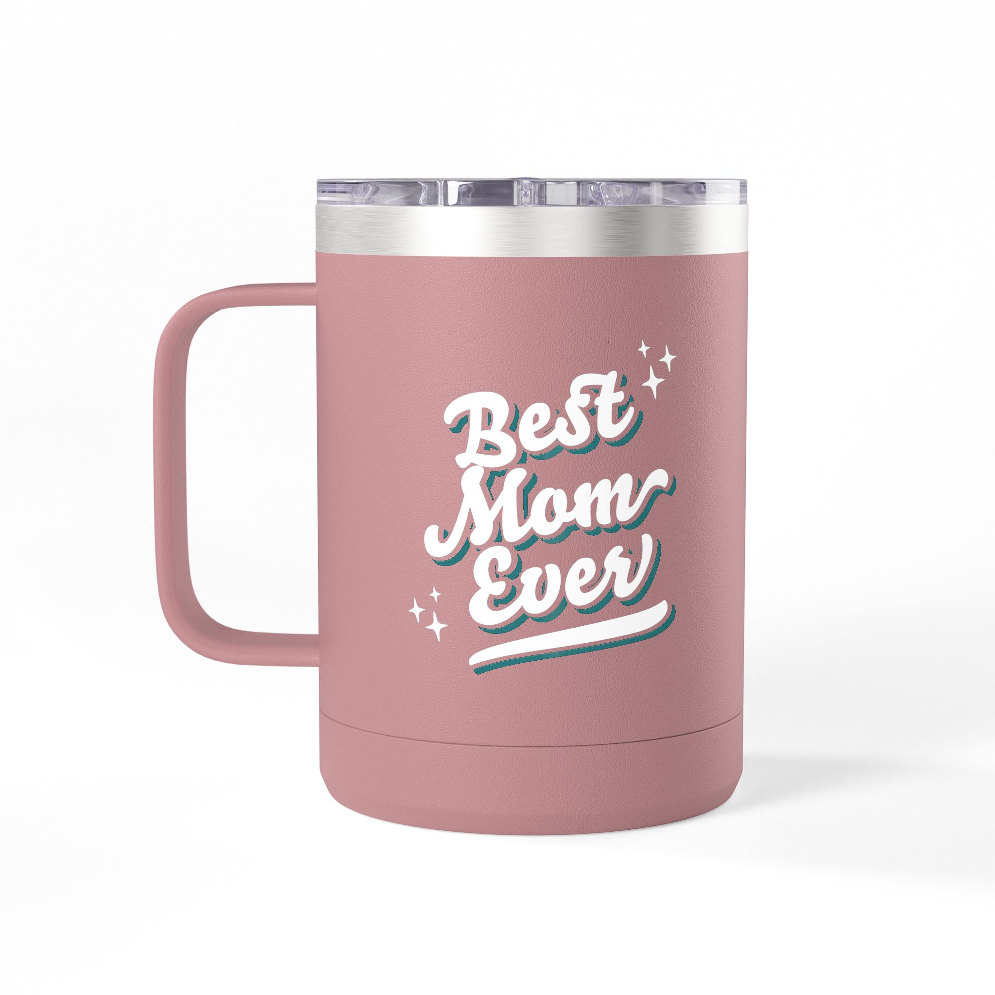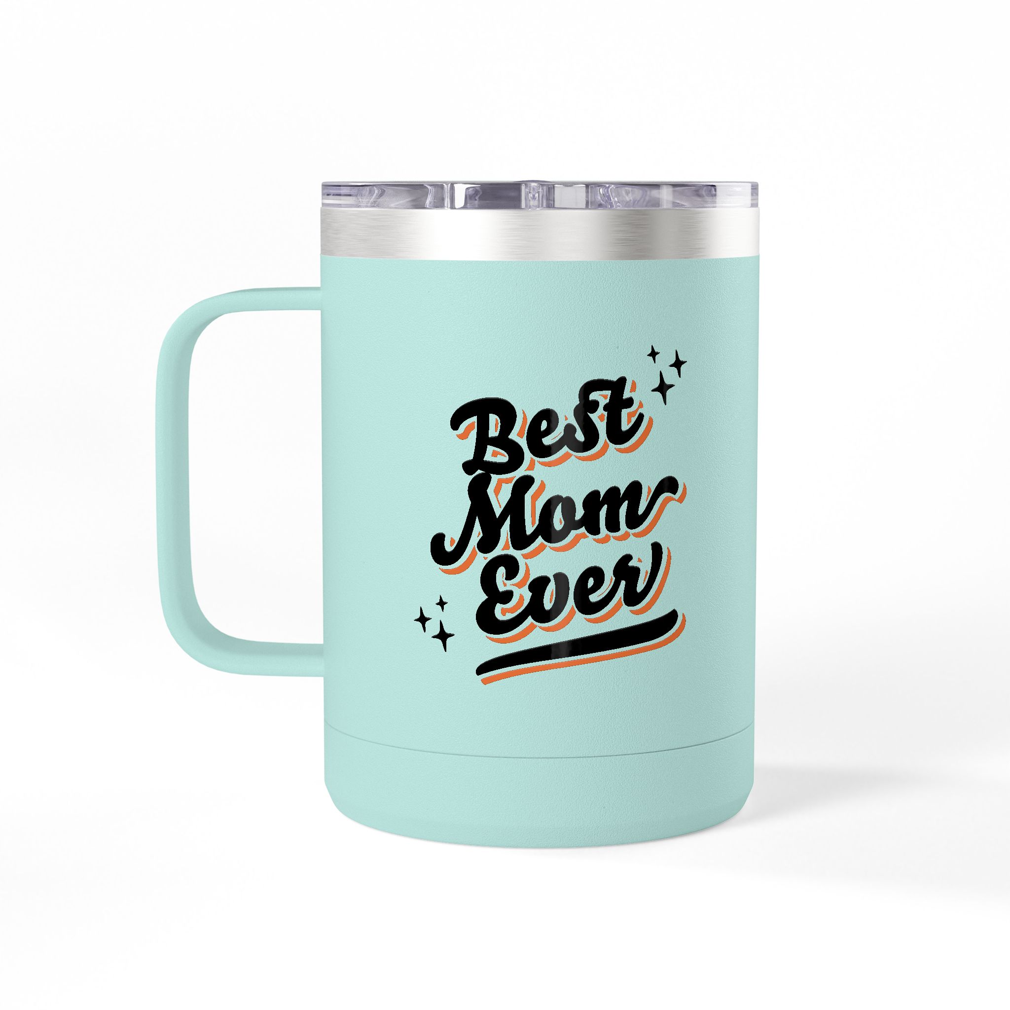Great travel mug gift for the best Mom Ever! Mom will love this for Mother’s Day, birthday, or for any day. This 15oz stainless steel tumbler brings warmth to mornings and steadiness to long days. Double-wall insulation holds coffee hot and iced drinks cold for hours, while the ergonomic handle and leak-proof lid make it easy to carry between meetings, the shop, or the trailhead. The powder-coated finish with glossy print gives the cup a clean, modern look that stands up to daily use. Lightweight yet durable, it feels substantial in hand and resists rust and wear — a reliable companion for anyone who treats their drink as part of the ritual.