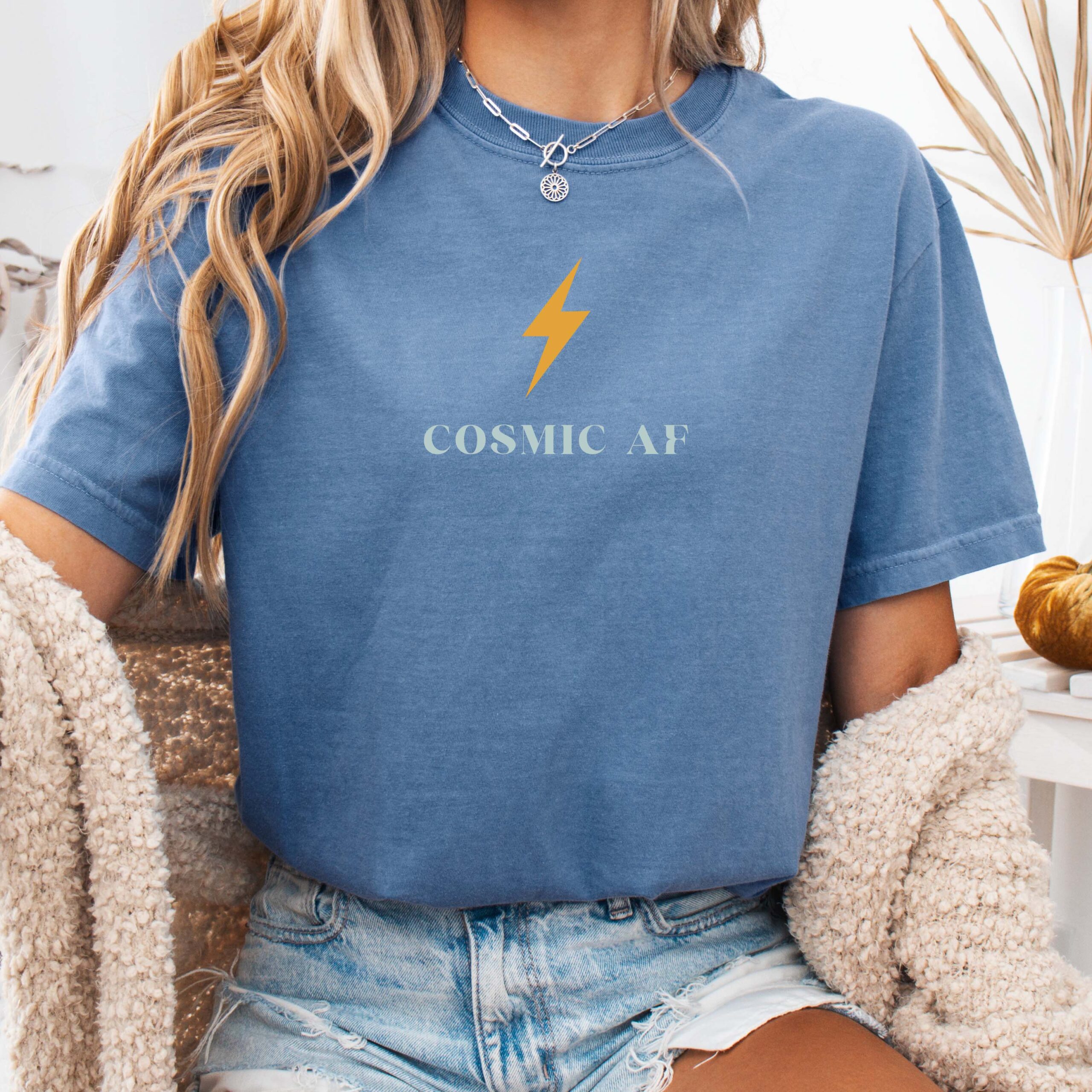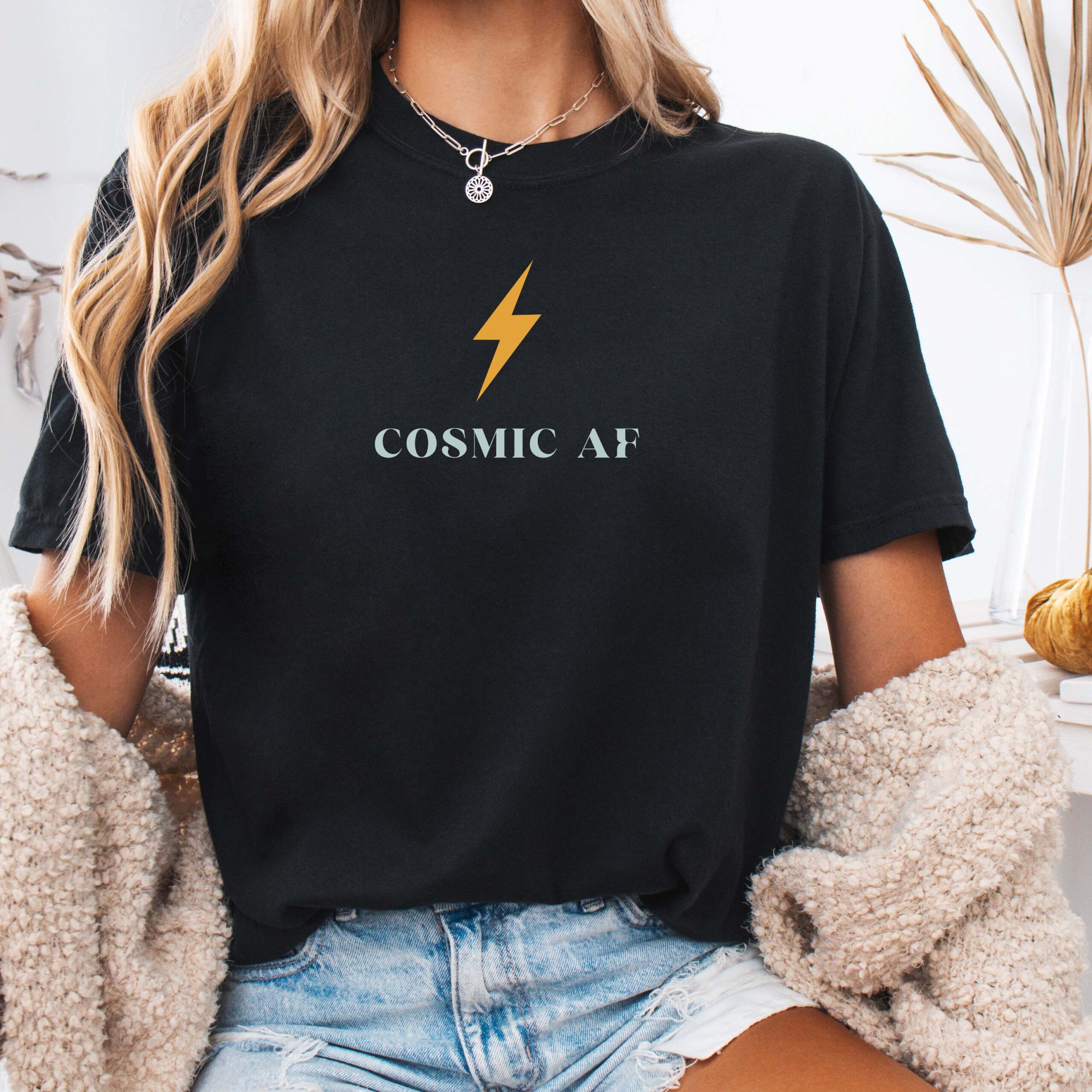 Be Cosmic AF. Soft, lived-in comfort with a little cosmic edge. This heavyweight garment-dyed tee settles into a muted charcoal and feels broken-in from day one. A small lightning bolt and subtle “COSMIC AF” text sit at the chest, giving quiet, modern mystic energy—easy to wear with high-waist jeans, layered under an oversized jacket, or tossed on for late-night rooftop stargazing. The relaxed cut and thick cotton hold their shape while the garment-dye wash creates a subdued, vintage vibe that grows more personal with every wash. For people who like their everyday pieces to feel meaningful without shouting, this tee reads like a private symbol: low-key celestial, slightly rebellious, and built to last.