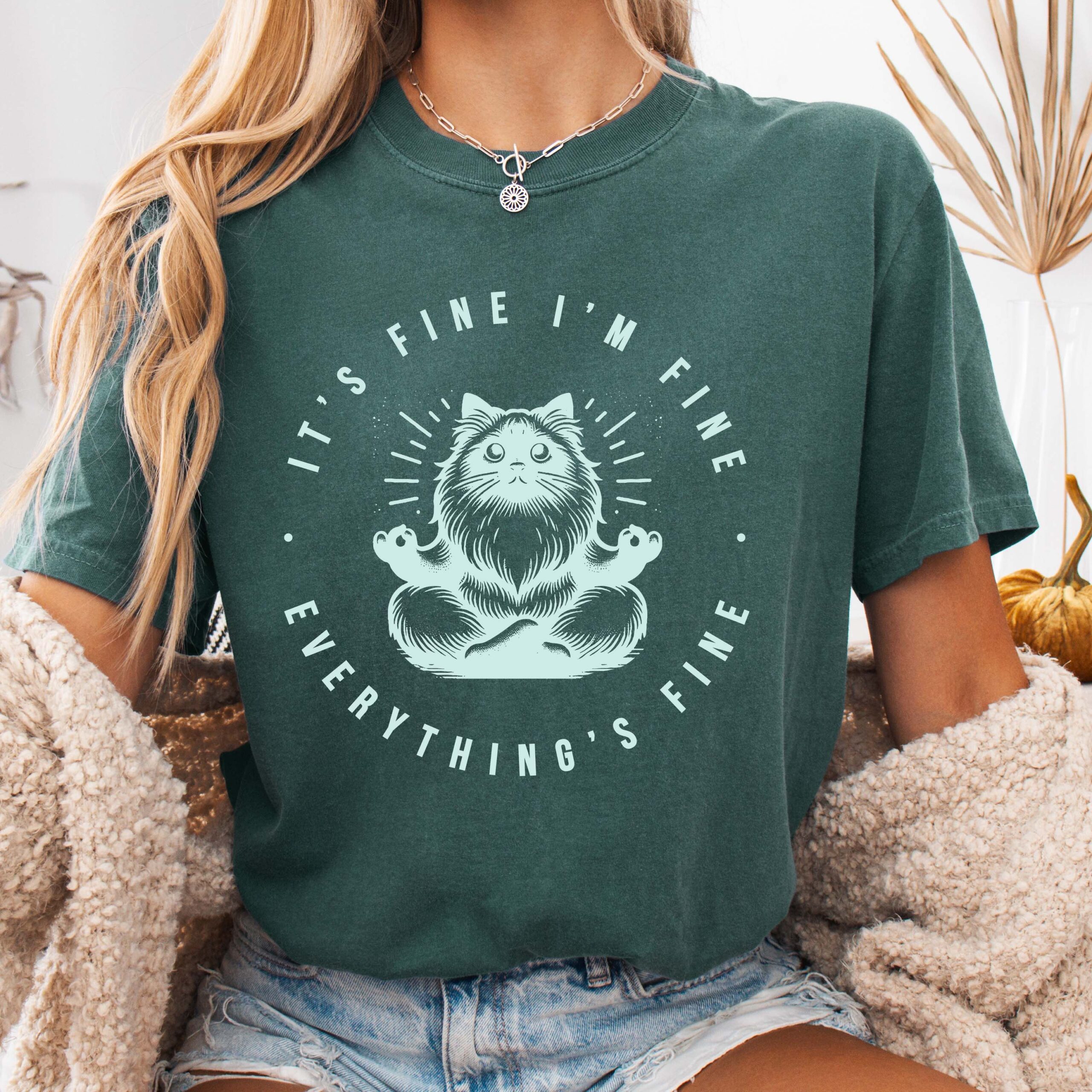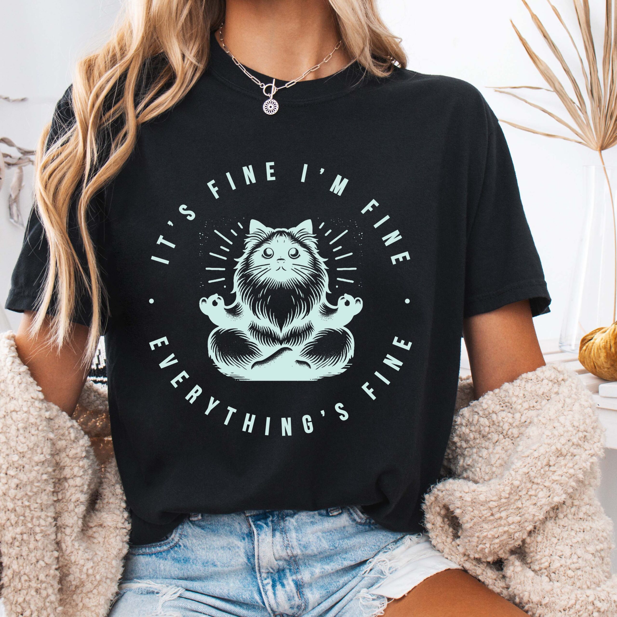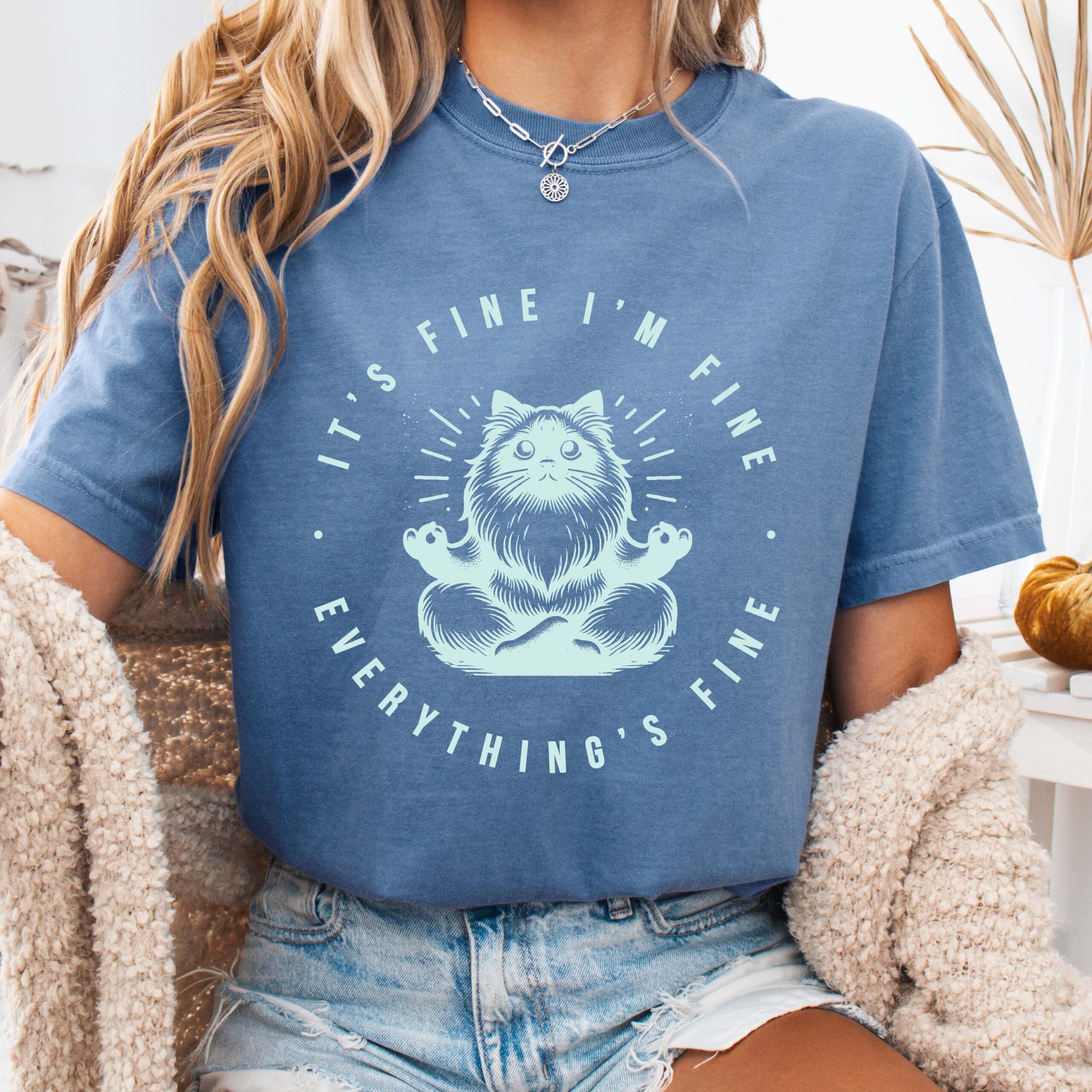 A relaxed, garment-dyed tee that feels lived-in from the first wear. Soft, heavyweight ring-spun cotton drapes just right while the subtle vintage wash gives each shirt a unique tone. Centered on the chest is a hand-drawn meditative cat illustration encircled by the wry motto “It’s fine, I’m fine, everything’s fine” — a quiet joke that reads like a private nod among friends. Lightweight enough for layering, sturdy enough for weekly rotation, this shirt moves from slow mornings with coffee to late-night hangs without losing its comfort or attitude. Perfect shirt for the cat lover in your life, yogi in your life, or anyone who needs a little positive motivation and de-stress comical relief.