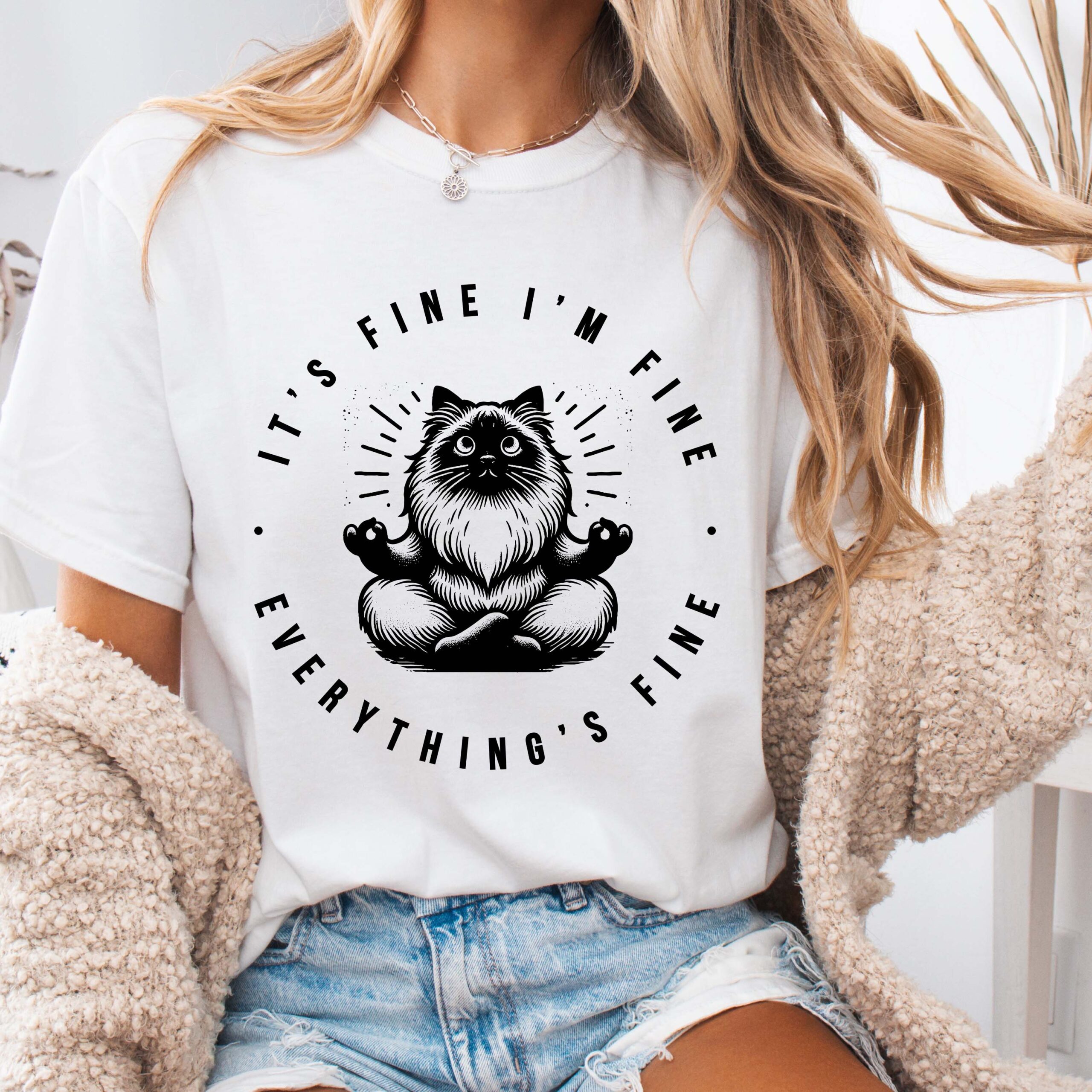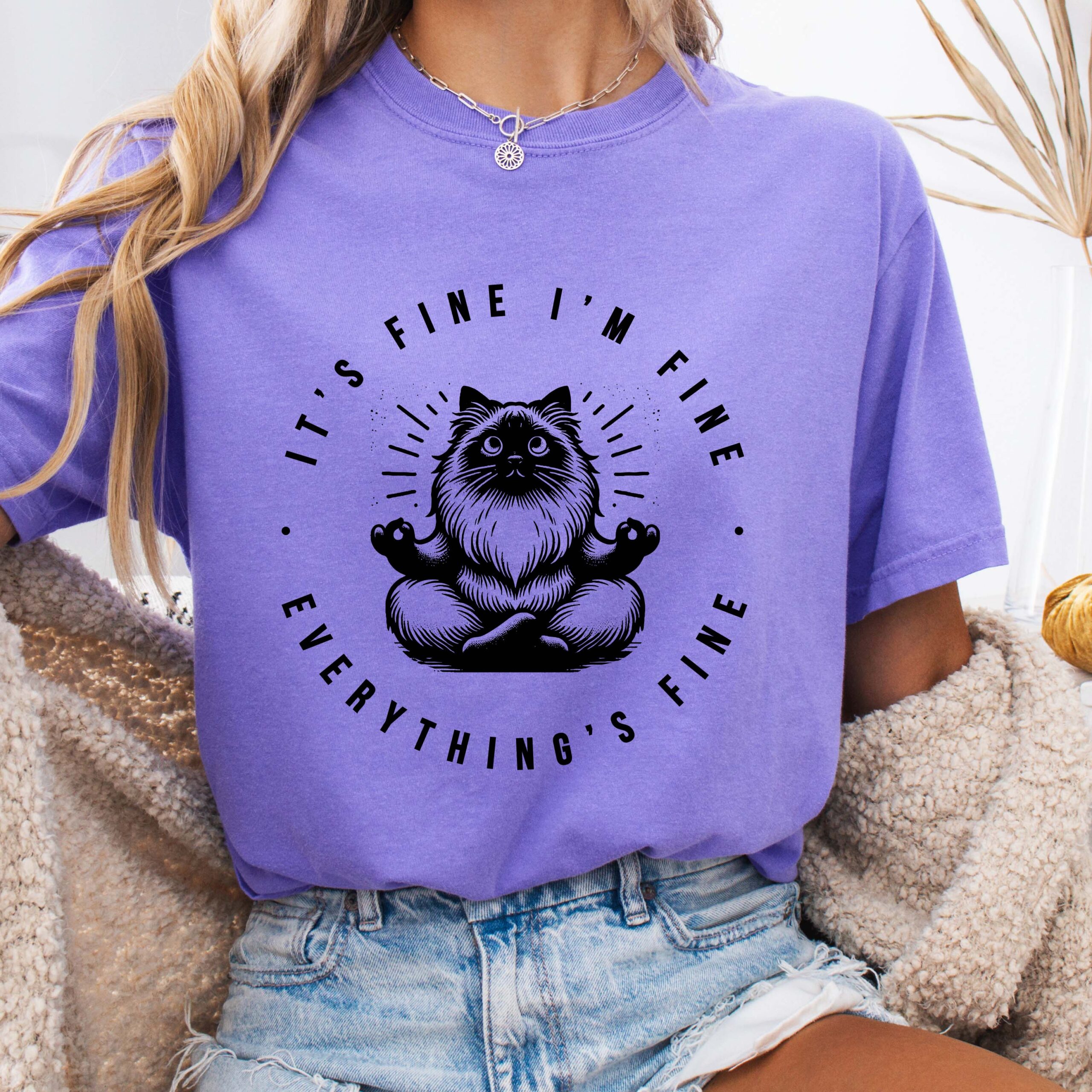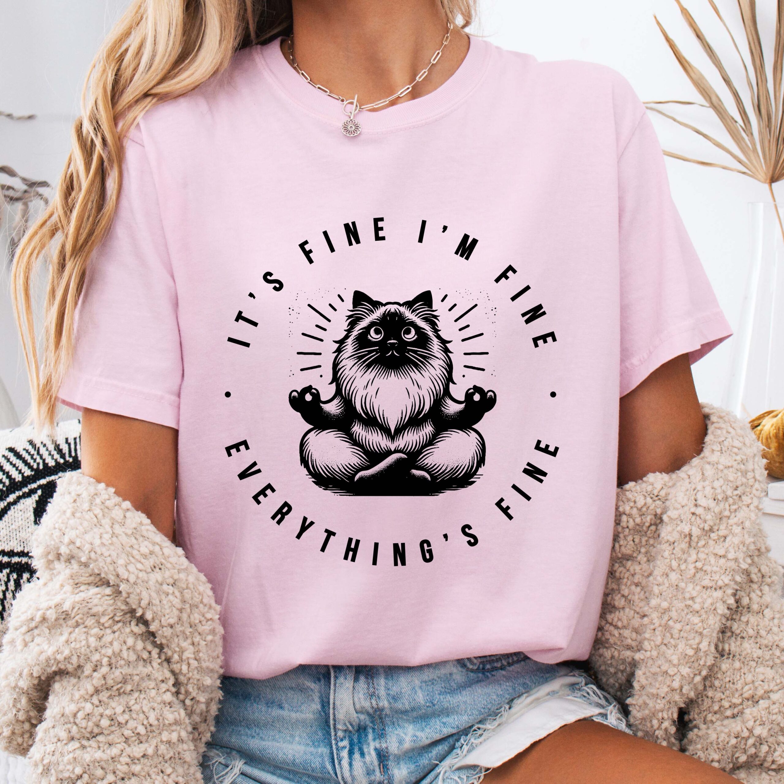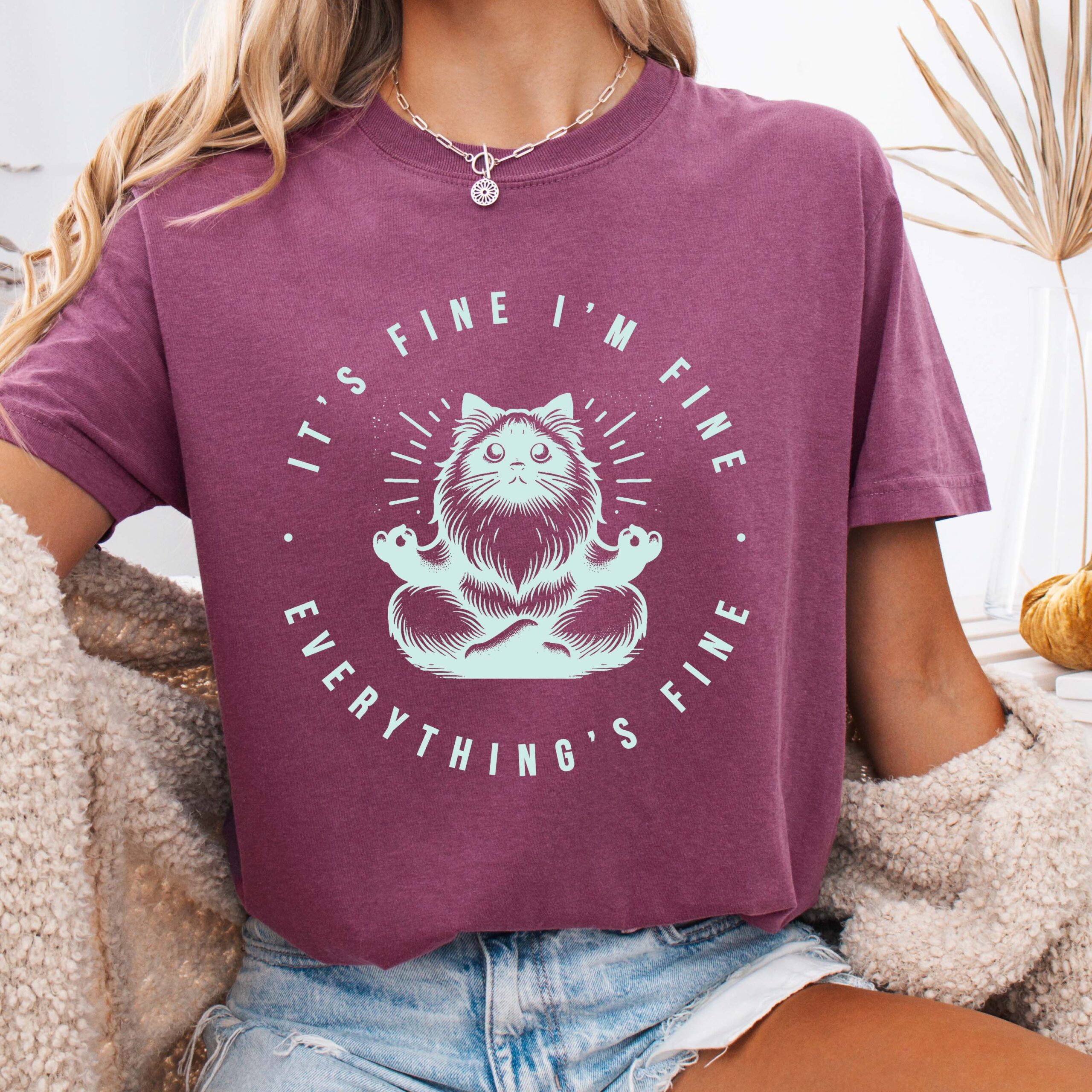 A relaxed, garment-dyed tee that feels lived-in from the first wear. Soft, heavyweight ring-spun cotton drapes just right while the subtle vintage wash gives each shirt a unique tone. Centered on the chest is a hand-drawn meditative cat illustration encircled by the wry motto “It’s fine, I’m fine, everything’s fine” — a quiet joke that reads like a private nod among friends. Lightweight enough for layering, sturdy enough for weekly rotation, this shirt moves from slow mornings with coffee to late-night hangs without losing its comfort or attitude. Perfect shirt for the cat lover in your life, yogi in your life, or anyone who needs a little positive motivation and de-stress comical relief.